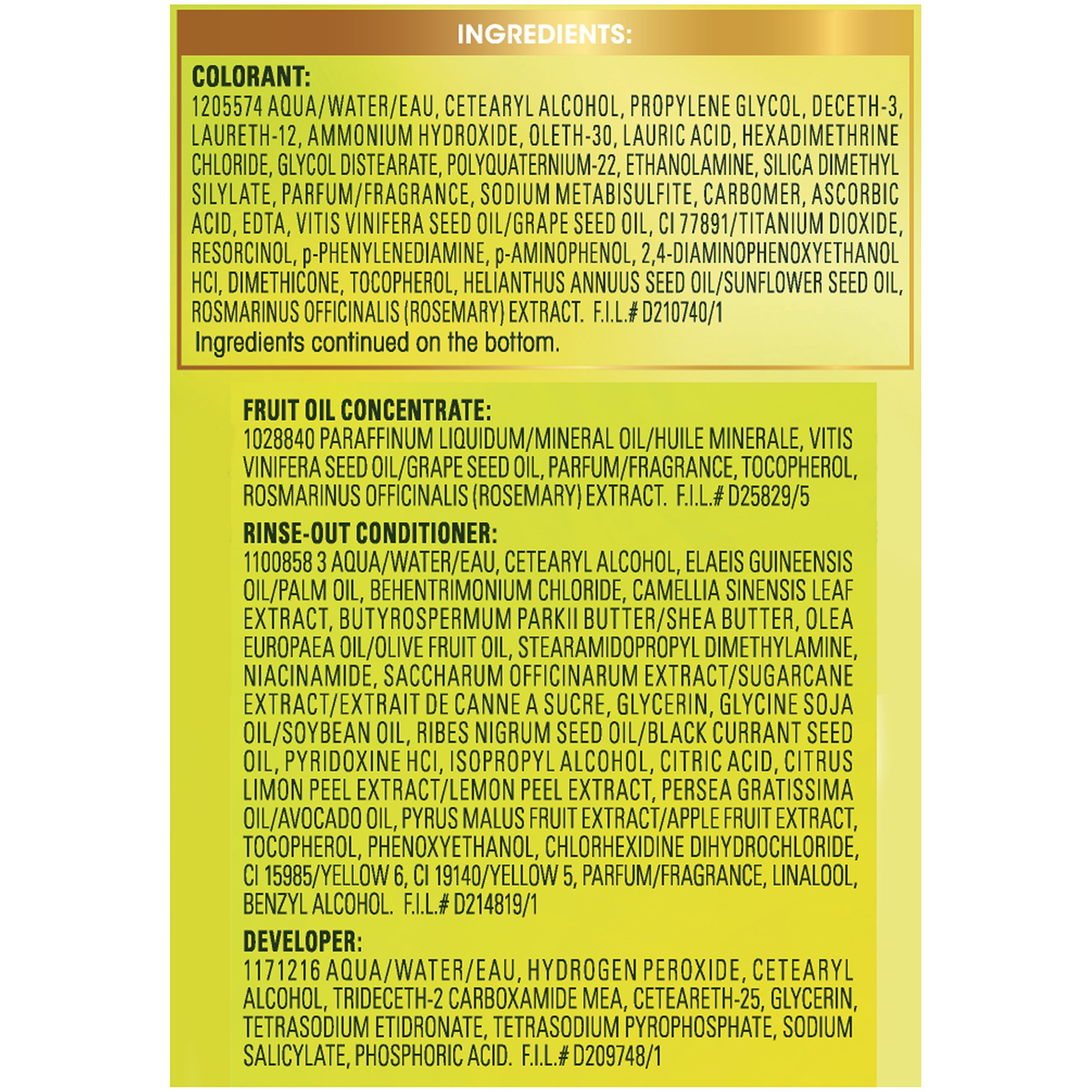 Garnier Nutrisse is the only permanent hair color creme that nourishes while you color with avocado, olive, and shea oils. The nourishing color creme enriched with fruit oil concentrate, penetrates deep into hair fibers to nourish and condition your hair so it takes color better and holds it longer, root-to-tip. Garnier Nutrisse delivers rich, radiant, long-lasting hair color with 100% grey coverage. ? Permanent, nourishing hair color creme with three fruit oils- avocado, olive, and shea ? The only hair color creme with a separate ampoule of grape seed oil to start nourishing as you color ? Rich, radiant, long-lasting color with 100 percent grey coverage ? Available in 45 Nourishing Shades Always read the hair color instructions insert in the box. Store between 50? and 80? F. Questions? Garnier Nutrisse has expert color consultants to help you. Call: 1-800-4GARNIER (1-800-442-7643). IMPORTANT: Hair color can cause an allergic reaction. Do not use if you?ve already had a reaction to a hair color product or if scalp is sensitive, itchy or damaged. Tattoos may increase risk of an allergic reaction. Do skin allergy test 48 hours before each use of this product. Don?t use over compound henna or progressive color. Wait at least 14 days after bleach, relaxing or perm before use. Don?t use on children. This is a safety summary. Read all labeling and instructions completely.