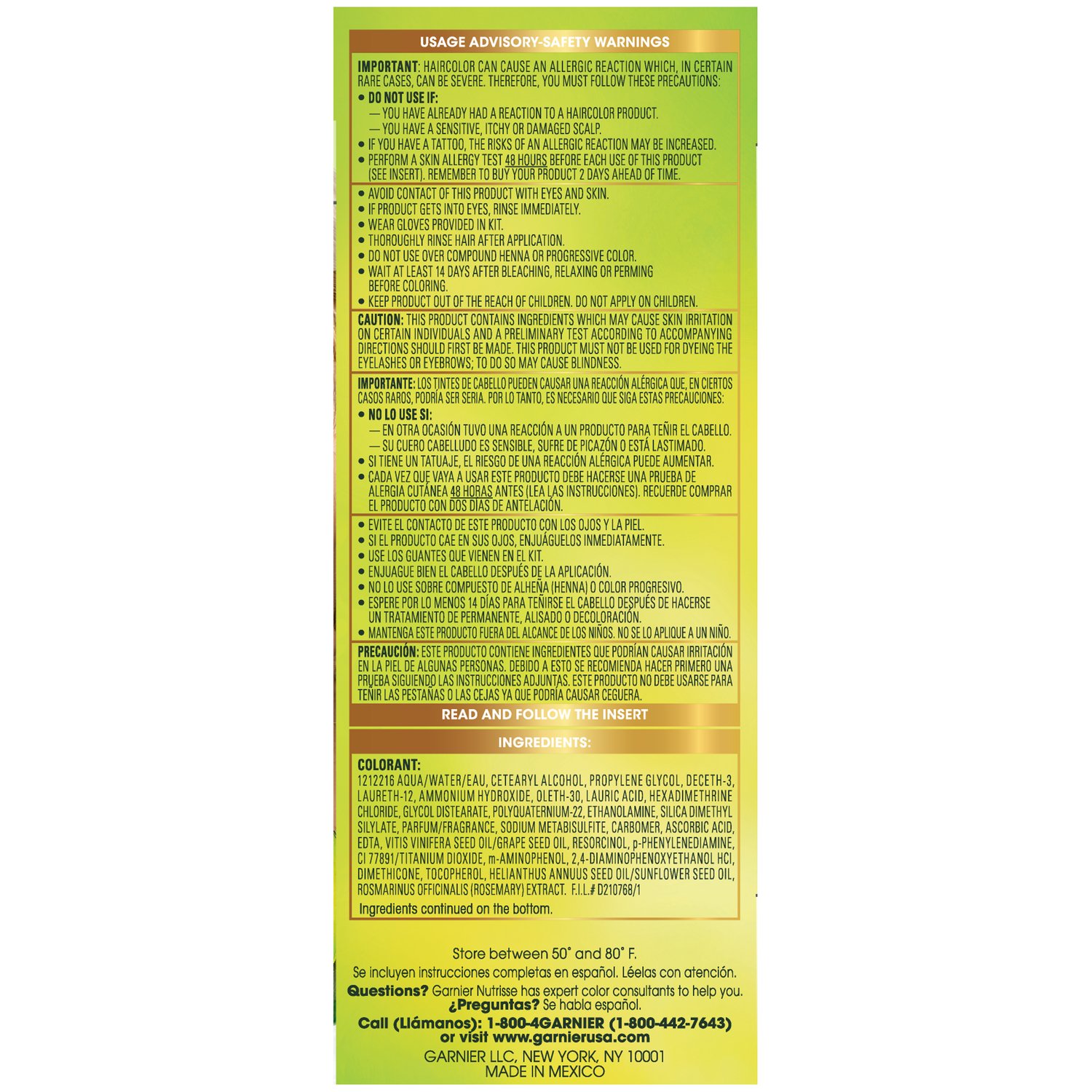Garnier Nutrisse is the only permanent hair color creme that nourishes while you color with avocado, olive, and shea oils. The nourishing color creme enriched with fruit oil concentrate, penetrates deep into hair fibers to nourish and condition your hair so it takes color better and holds it longer, root-to-tip. Garnier Nutrisse delivers rich, radiant, long-lasting hair color with 100% grey coverage. ? Permanent, nourishing hair color creme with three fruit oils- avocado, olive, and shea ? The only hair color creme with a separate ampoule of grape seed oil to start nourishing as you color ? Rich, radiant, long-lasting color with 100 percent grey coverage ? Available in 45 Nourishing Shades Always read the hair color instructions insert in the box. Store between 50? and 80? F. Questions? Garnier Nutrisse has expert color consultants to help you. Call: 1-800-4GARNIER (1-800-442-7643). IMPORTANT: Hair color can cause an allergic reaction. Do not use if you?ve already had a reaction to a hair color product or if scalp is sensitive, itchy or damaged. Tattoos may increase risk of an allergic reaction. Do skin allergy test 48 hours before each use of this product. Don?t use over compound henna or progressive color. Wait at least 14 days after bleach, relaxing or perm before use. Don?t use on children. This is a safety summary. Read all labeling and instructions completely.