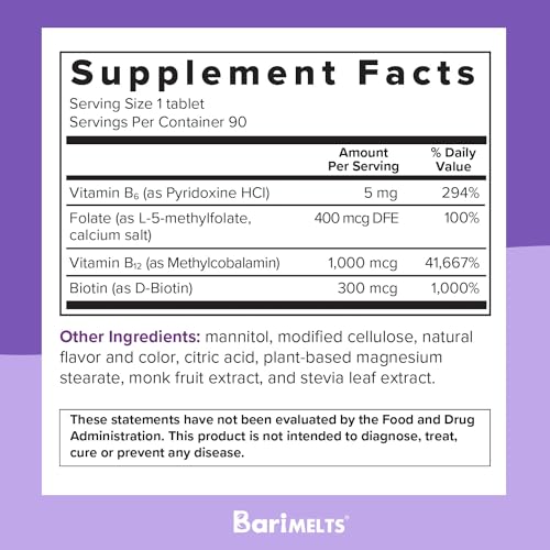 BariMelts Vitamin B12 Plus – 3 Month Supply (90 Fast-Dissolving Tablets) – Post-Op Bariatric Vitamins with Methylcobalamin B12, Vitamin B6, Methylated Folate, and Biotin?