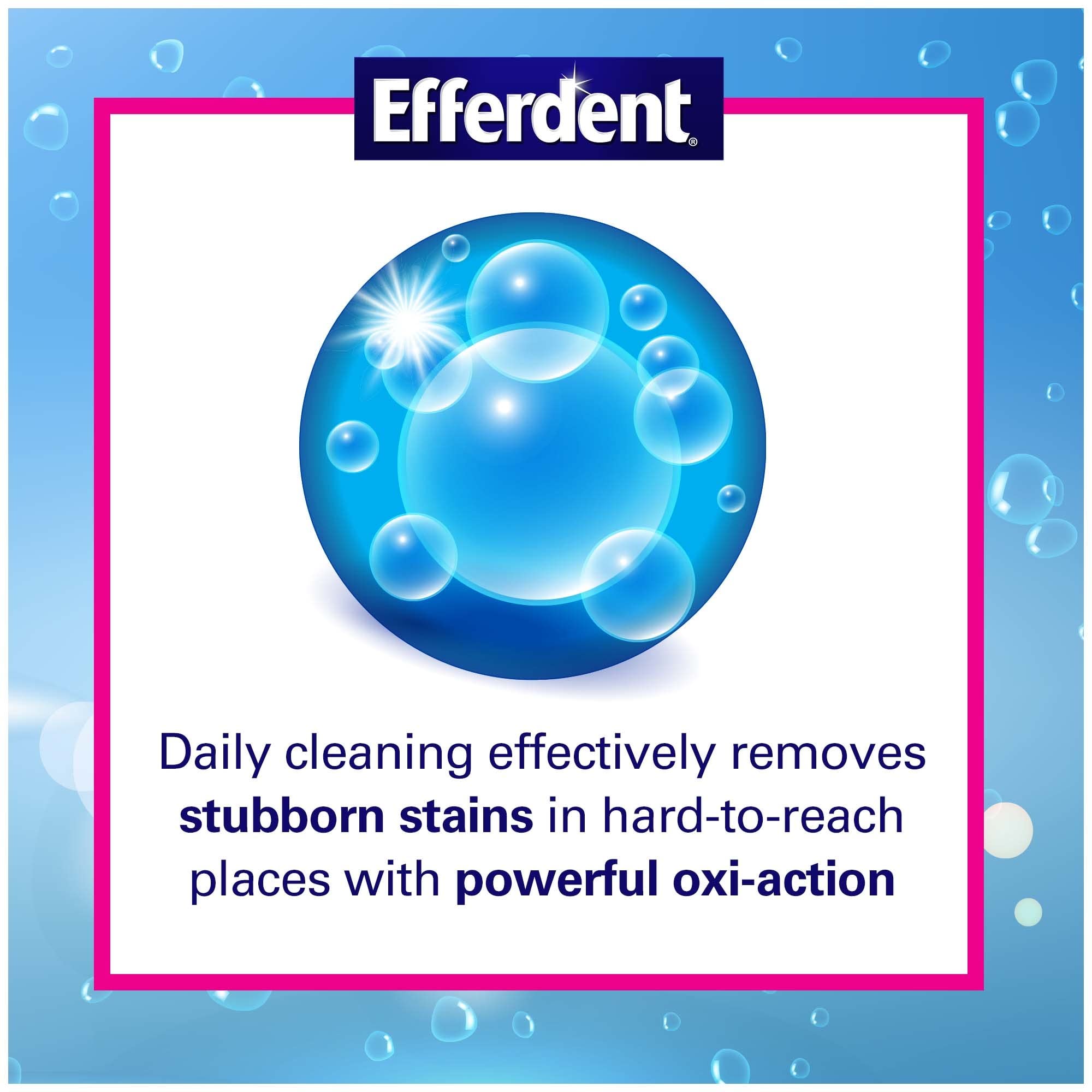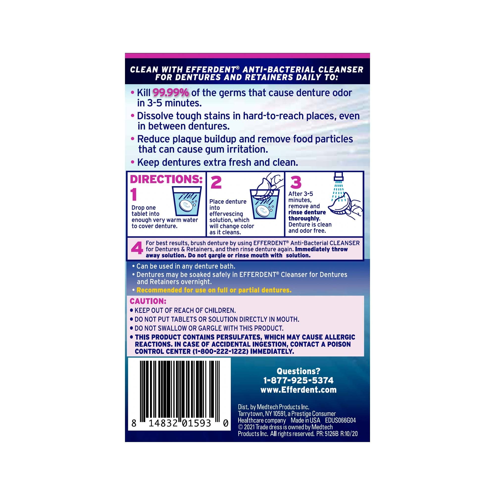 Efferdent Complete Clean Anti-Bacterial Denture Cleanser Tablets provide a 5-in-1 system to clean full-plate dentures, partials, retainers and other dental appliances. Using its powerful effervescent cleaning action, it kills 99.9% of odor-causing bacteria, while effectively reducing plaque buildup. The first denture cleanser tablet brand accepted by the American Dental Association, Efferdent Complete Clean Denture Cleanser eliminates the most stubborn stains in hard-to-reach places – even between teeth. It also removes food particles that can cause gum irritation, so your mouth will feel just as good as it looks. You’ll smile with confidence knowing that your teeth and gums are clean, bright and healthy.
