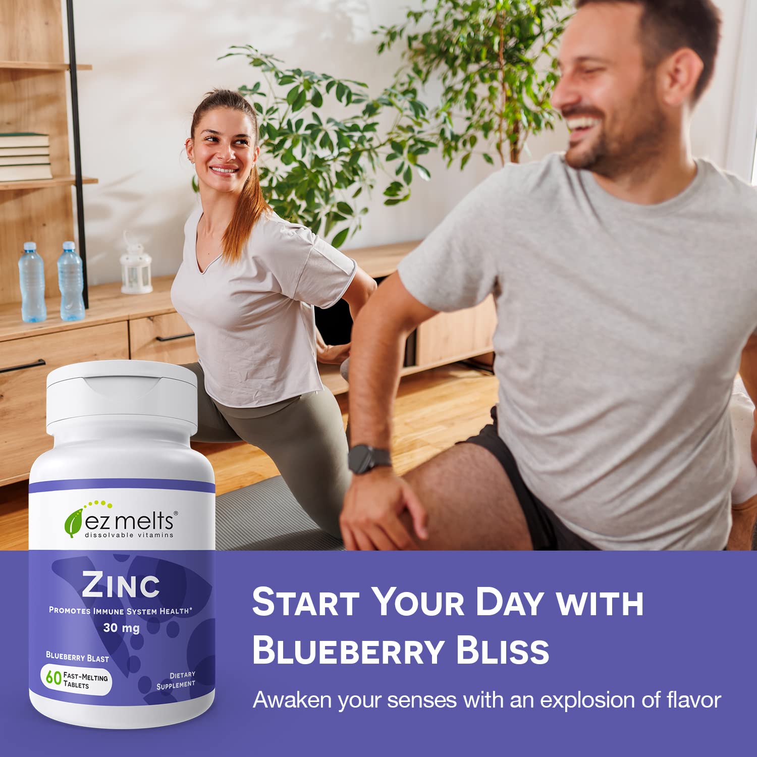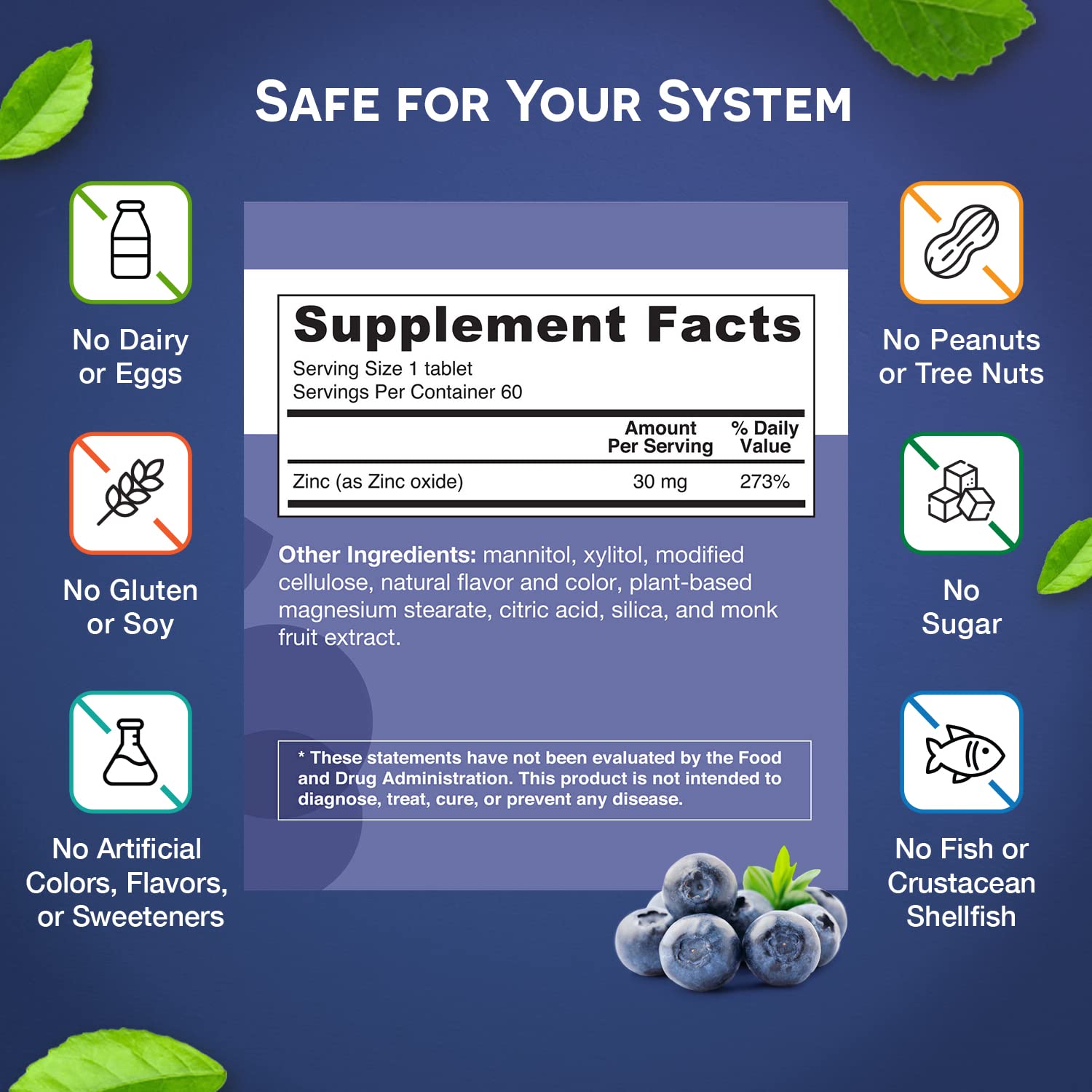 • Melts In Your Mouth ? No chewing or swallowing an entire tablet necessary. Your one-a-day zinc women and men?s vitamins dissolve right on your tongue. With zero sugar, these zinc 30 mg supplements will delight your senses without compromising your diet. Taste the zing of blueberry!