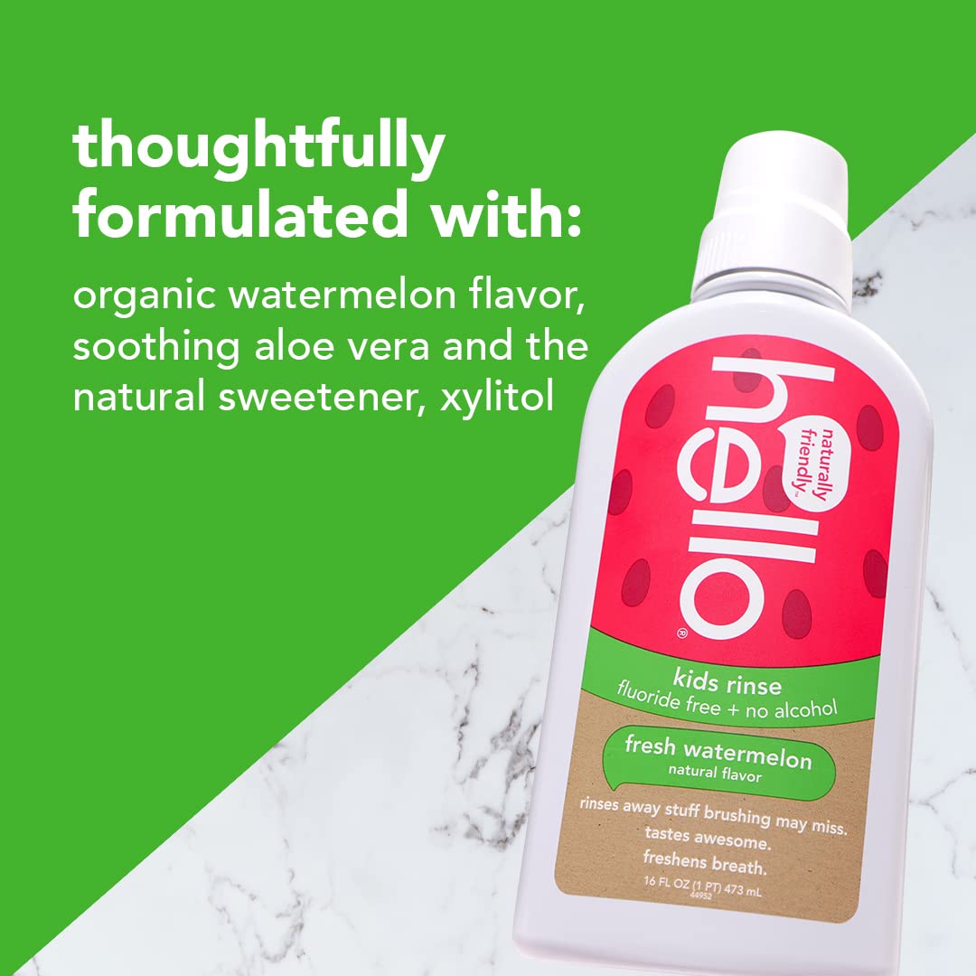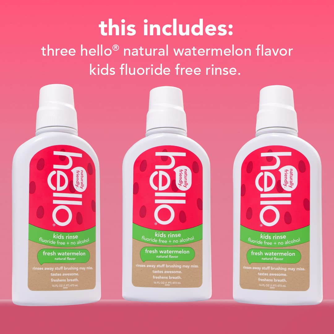 - Contains three 16 ounce bottles of hello kids fluoride free natural watermelon flavor rinse