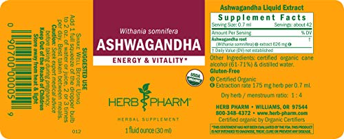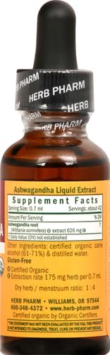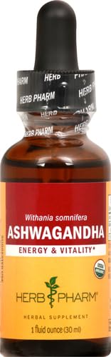 Herb Pharm Certified Organic Ashwagandha Extract for Energy and Vitality, Grain, Organic Cane Alcohol, 1 Ounce