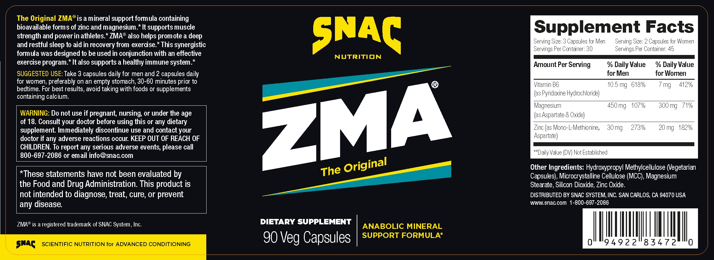SNAC ZMA The Original Recovery & Sleep Supplement, Promotes Muscle Recovery, Immune Support & Restorative Sleep with Zinc, Magnesium & Vitamin B6 (90 Veggie Capsules)