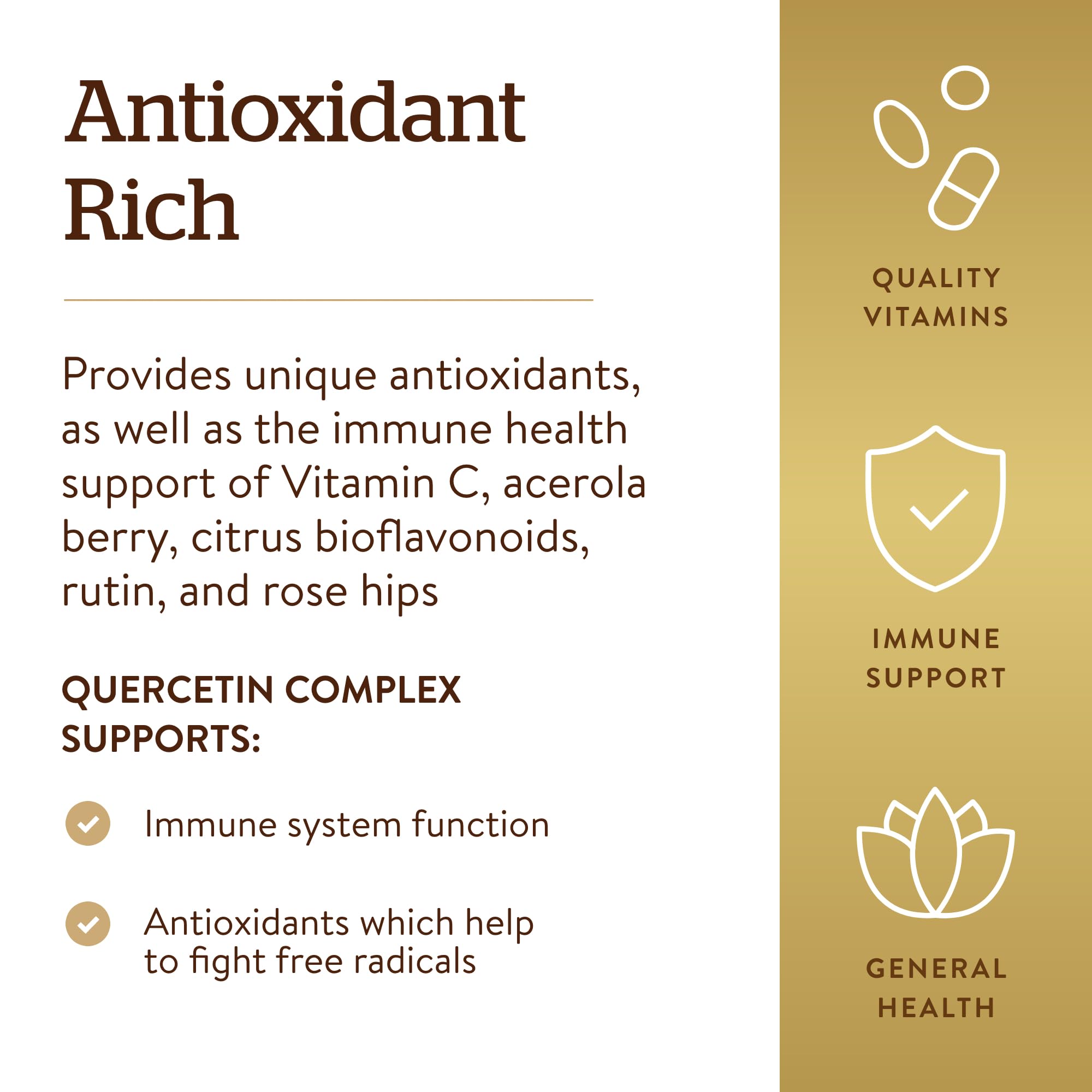 - Immune Health Support; Solgar Quercetin Complex includes the important bioflavonoid Quercetin in a synergistic formula with Ester-C Plus to provide immune health support