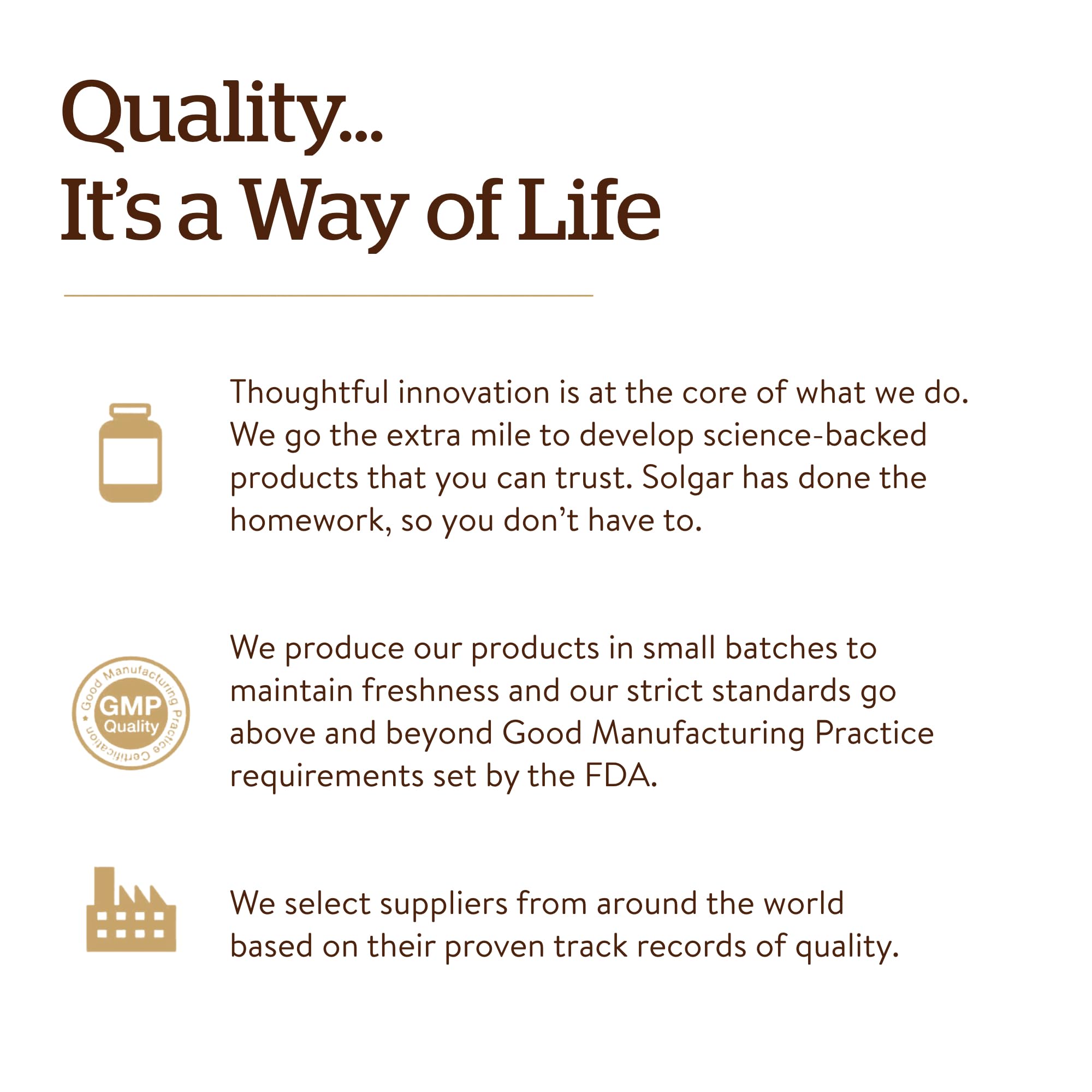 - The Gold Standard: For over 70 years, Solgar has been committed to quality, health, and well-being. Our mission is to create the finest nutritional supplements in small batches, through tireless research, using only the finest raw materials