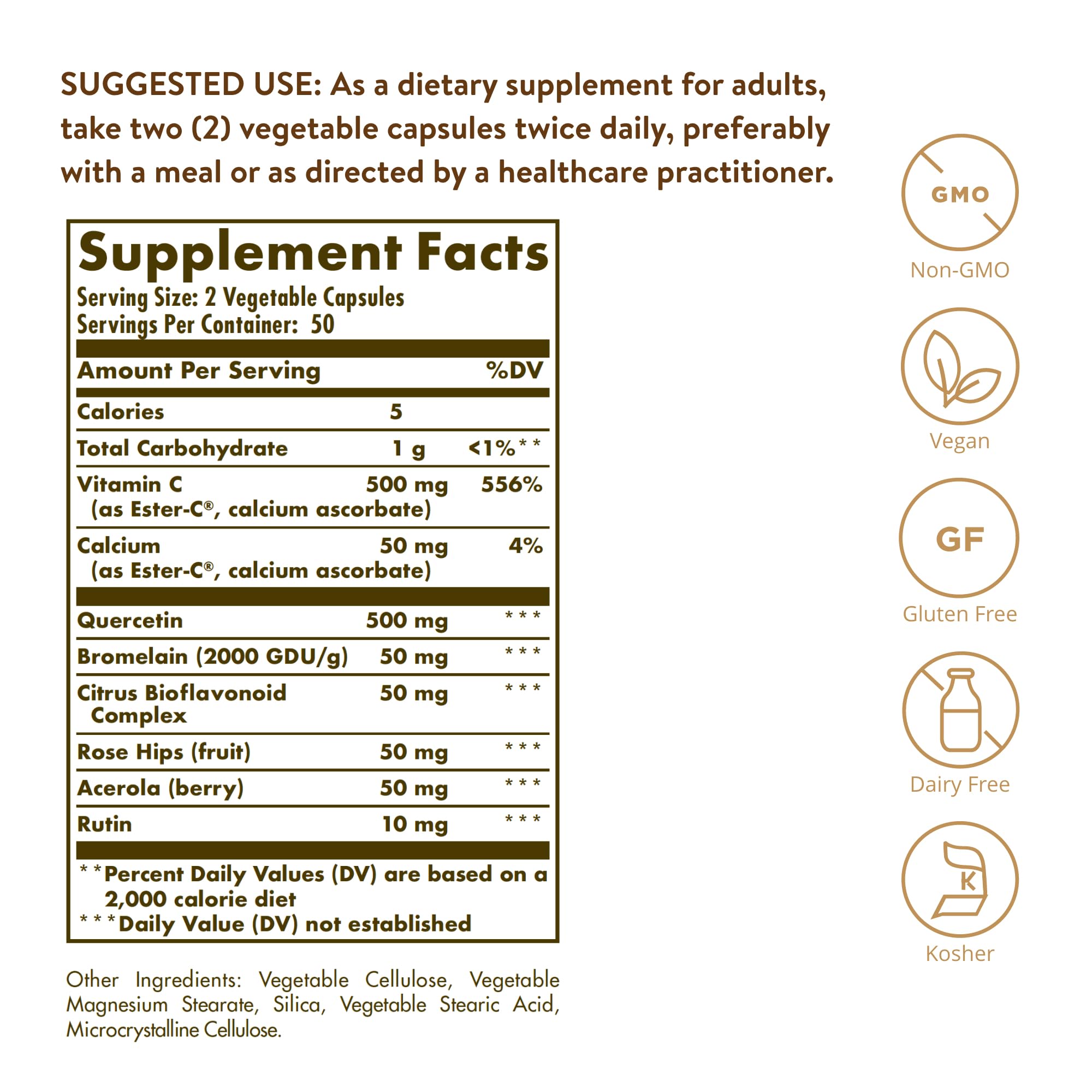 - Non-GMO, Gluten, Wheat & Dairy Free; Solgar Quercetin Complex is suitable for vegans and free of: gluten, wheat, dairy, soy, yeast, sugar, sodium, artificial flavor, sweetener, preservatives, and color