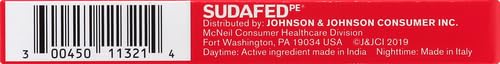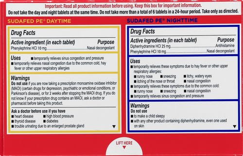 Get powerful relief from sinus pressure and sinus congestion with Sudafed PE Sinus Congestion Day + Night Maximum Strength Decongestant Tablets. From the #1 pharmacist recommended brand among oral OTC decongestants, this multi-pack contains both daytime and nighttime tablets for effective multiple symptom relief. Both the day and night formulas contain 10 milligrams of the nasal decongestant phenylephrine HCl to temporarily relieve sinus congestion and pressure, as well as nasal congestion due to the common cold, hay fever, or upper respiratory allergies. The nighttime decongestant medicine also contains 25 mg of the antihistamine diphenhydramine HCl per tablet, which works to temporarily relieve sneezing, runny nose, itchy, watery eyes and itchy throat or nose to help you sleep at night. This maximum strength medicine can be used by adults and children 12 years and older for powerful sinus pressure and congestion relief.