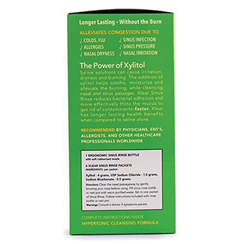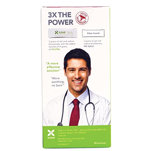 - THE XYLITOL REVOLUTION: Xlear?s revolutionary patented saline solution formula adds 4g of xylitol along with 2g of saline. Unlike the typical nasal rinse , this is a superior, longer-lasting, proactive treatment that tackles the root cause of congestion and infection rather than just relieving short-term symptoms. Our natural sinus rinse works great with any nasal irrigation system or as a replacement for neti pot salt packets as a daily nose cleaner.