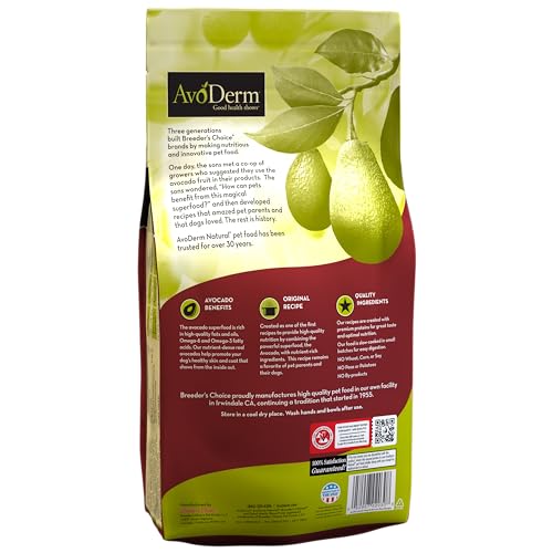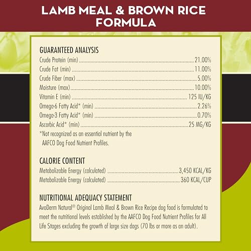 AvoDerm Original Lamb Meal & Brown Rice Recipe provides healthy balanced nutrition for your dog. High quality ingredients ensure that you are providing the optimal nutrition your pet needs. No corn. No wheat. No artificial colors. AvoDerm has vitamins, minerals, and antioxidant nutrients to help protect your dog’s immune function. AvoDerm is formulated to be rich in high quality fats and oils with a balanced Omega-6 to Omega-3 fatty acid ratio. The right nutrients in the right proportions are indispensable to keeping your dog’s skin healthy. Sometimes shortages or excesses of specific nutrients can lead to thin, rough coats. Avocado and avocado oil can help support the skin and coat from the inside out for the protection your pet needs. Feed AvoDerm regularly to sustain the highest level of nutrition for your dog from the inside out.
