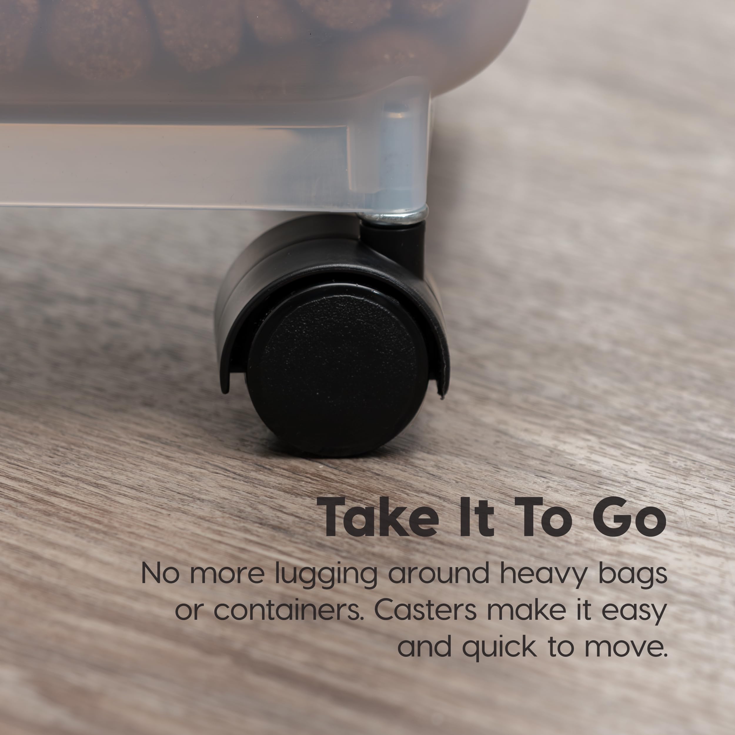• ROLL IT AROUND: The storage bins come with attachable casters, so you have the option to have them off or on. Store it on a shelf or attach the wheel to roll it from the storage area to your dog or cat bowl