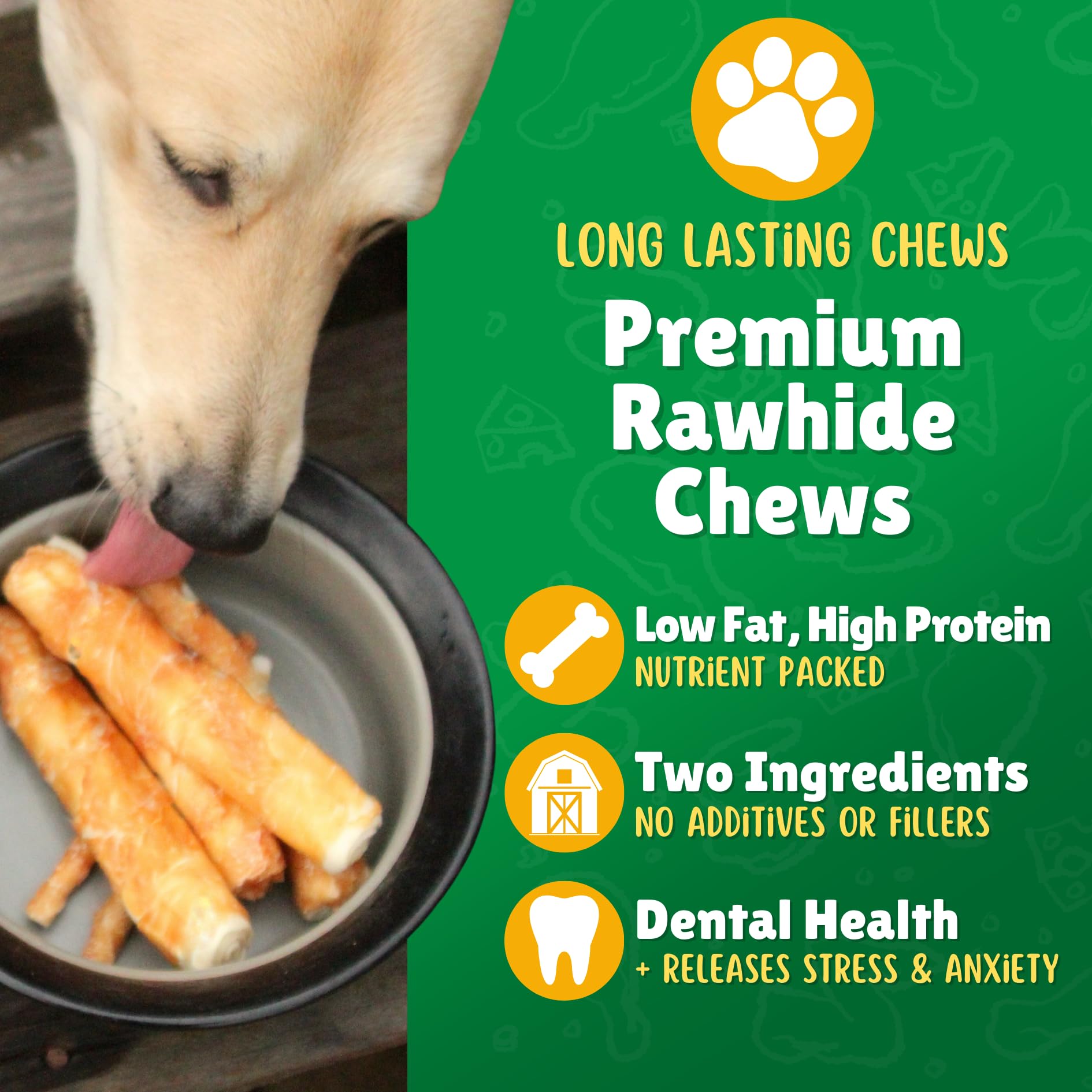 - Tail-Wagging Puppy Treats: Spoil your dog with our mouthwatering chicken-wrapped beefhide dog rawhide sticks! The combination of beef hide and chicken breast provides a source of protein, which is vital for muscle development, weight management, and overall health