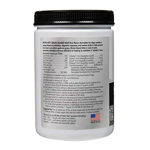 Nutri-Vet Grass Guard Max liver flavor chewables for dogs contain a unique blend of probiotics, digestive enzymes and amino acids to help prevent lawn burn and yellow spots on grass. Grass Guard Max is easy to give, extremely palatable and very effective in helping to maintain a ‘spotless’ lawn.